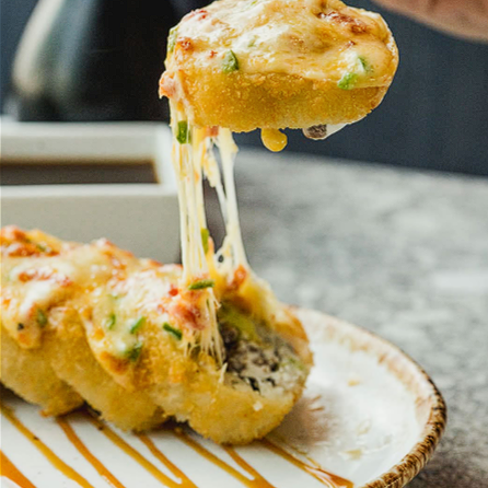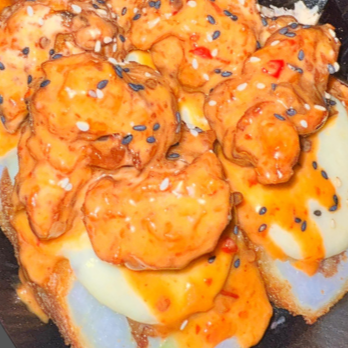 Por dentro: surimi, alga nori, queso crema, aguacate, pepino Topping: queso derretido, camarones spicy y ajonjoli.