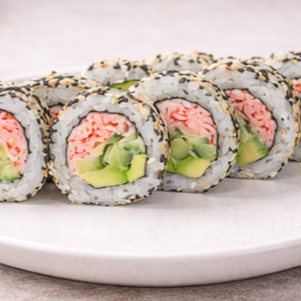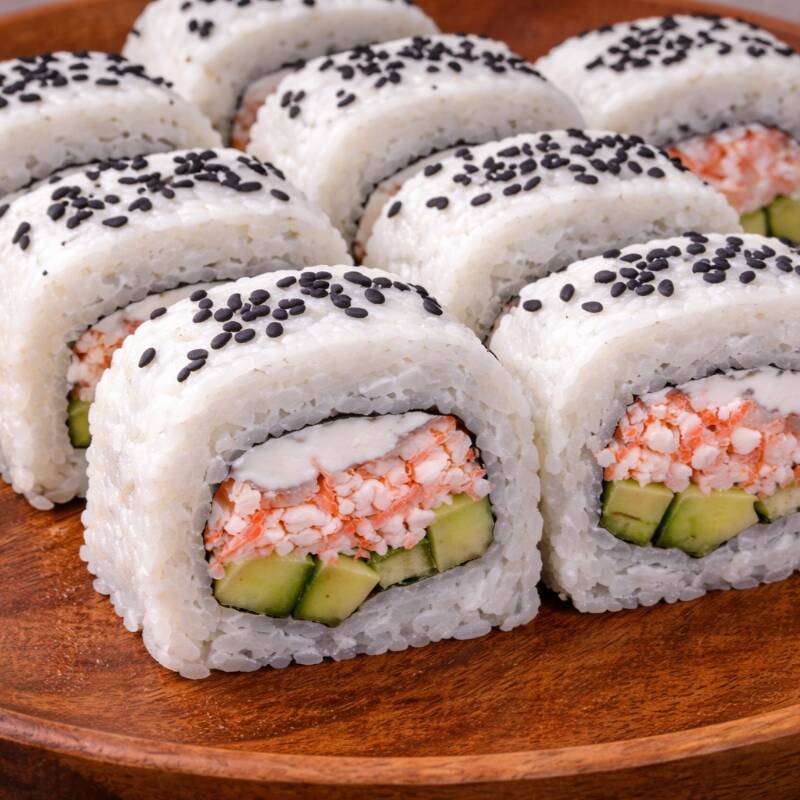 Por dentro: surimi, alga nori, Filadelfia, aguacate, Por fuera: cangrejo preparado y ajonjolí