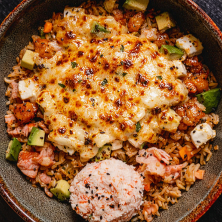 Arroz frito, salteado con calabaza, cebollín, zanahoria, brócoli, acompañado queso gratinado, proteína a escoger, tocino y serrano surimi, queso crema, aguacate, salsa de anguila, ajonjolí.
