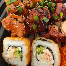 Por dentro: surimi, alga nori, Filadelfia, aguacate, pepino. Topping: 150 g de boneless bañados en salsa a escoger ajonjolí y cebollín.