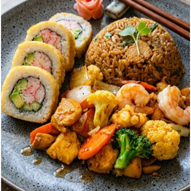 Verduras salteadas en salsa teriyaki con pollo, medio sushi de surimi y porcion de arroz frito. (brocoli, coliflor, zanahoria, cebollla, calabaza)