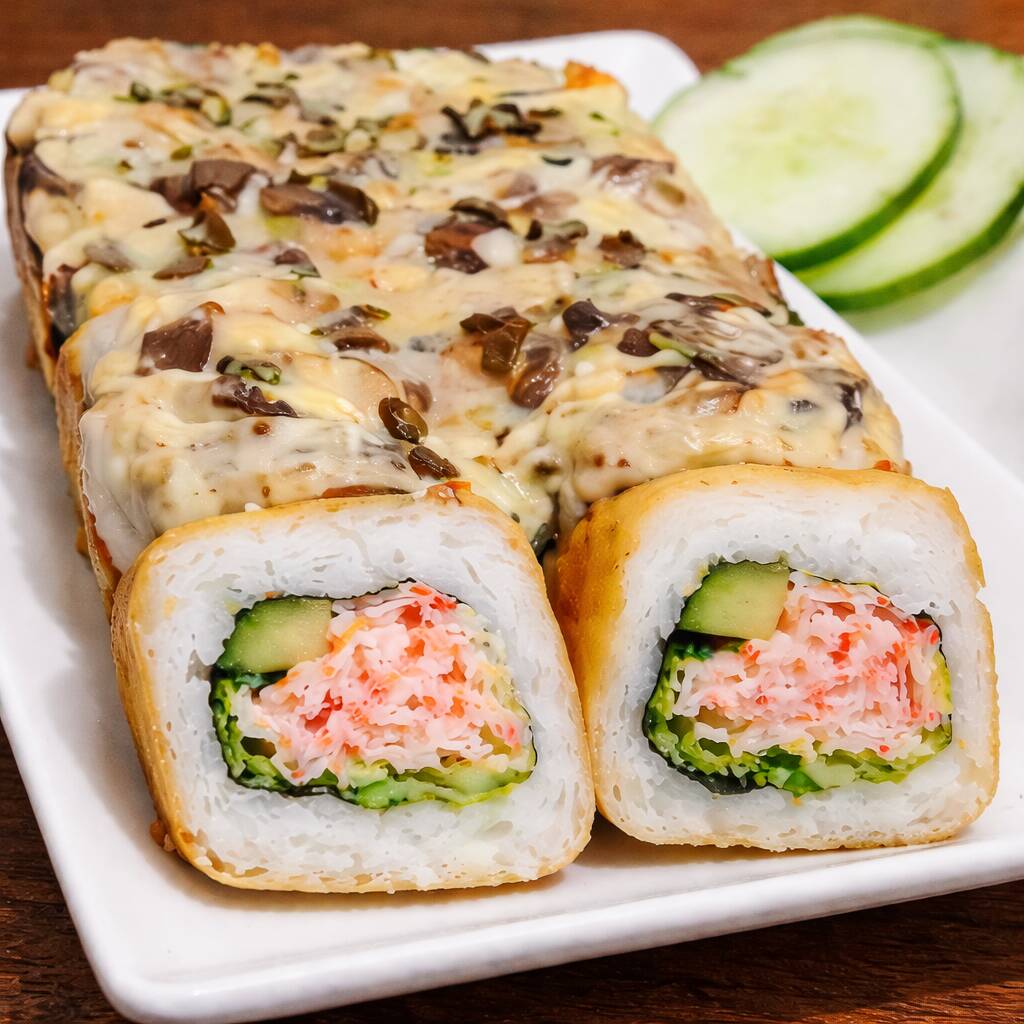 Por dentro: Camarón empanizado, alga nori, queso crema, aguacate, pepino Topping: Queso gratinado revuelto con tocino serrano queso crema, aderezo spicy, anguila.