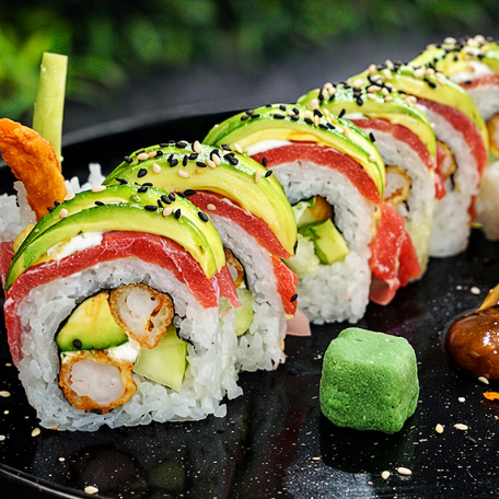 Por dentro: Camarón, alga nori, queso crema, aguacate, pepino. Por fuera: Laminado de aguacate y atún, cangrejo preparado, togarashi y ajonjolí.