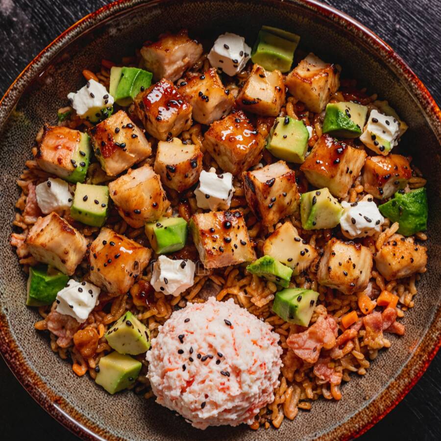 Arroz frito, salteado con calabaza, cebollín, zanahoria, brócoli, acompañado queso gratinado, proteína a escoger, tocino y serrano surimi, queso crema, aguacate, salsa de anguila, ajonjolí