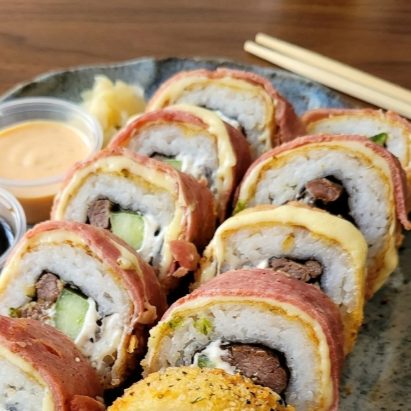 Por dentro: Camarón empanizado, alga nori, queso crema, aguacate, pepino Topping: Queso gratinado revuelto con tocino, carne de res, serrano, queso crema, aderezo spicy, anguila.