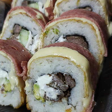 Por dentro: Carne de res, alga nori, queso crema, aguacate, pepino Por fuera: serrano, queso gratinado, cangrejo preparado, anguila.