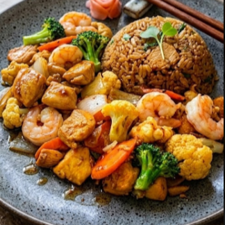 Arroz frito, salteado con calabaza, cebollín, zanahoria, brócoli y proteína a escoger, acompañado de surimi, queso crema, aguacate, salsa de anguila, ajonjolí.