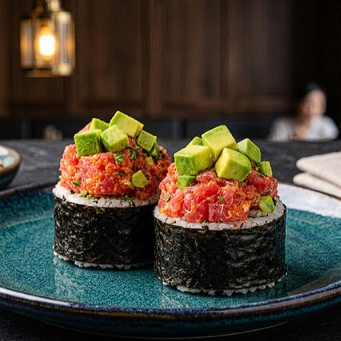 Por dentro: surimi, alga nori, queso crema, aguacate, pepino. Topping: Atún marinado en aderezo spicy, cubitos de aguacate, togarashi.