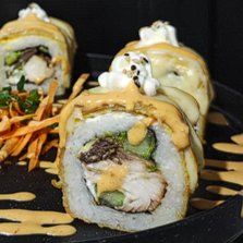 Por dentro: Pollo, pepino, queso crema, chile caribe, aguacate Arriba: Aguacate, queso derretido cangrejo preparado ajonjolí, salsa de anguila.