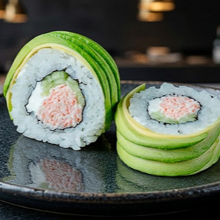 Por dentro: surimi, alga nori, queso crema, aguacate, pepino Por fuera: Laminado de aguacate, ajonjolí anguila y cangrejo preparado.