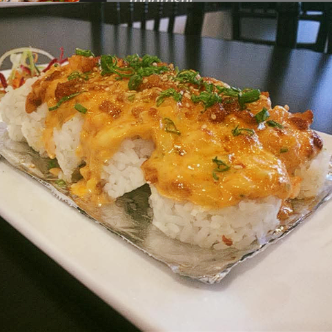 Por dentro: Camarón empanizado, alga nori, queso crema, aguacate, pepino Topping: Salmon en cubitos revuelto con serrano, queso gratinado con chipotle y salsa de anguila.