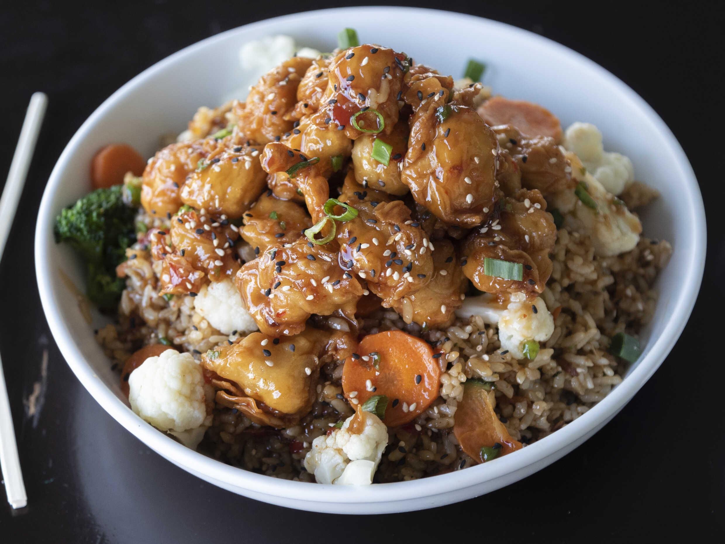 Cama de arroz, vegetales al vapor, cubierto de pollo crujiente, bañado en salsa picosa