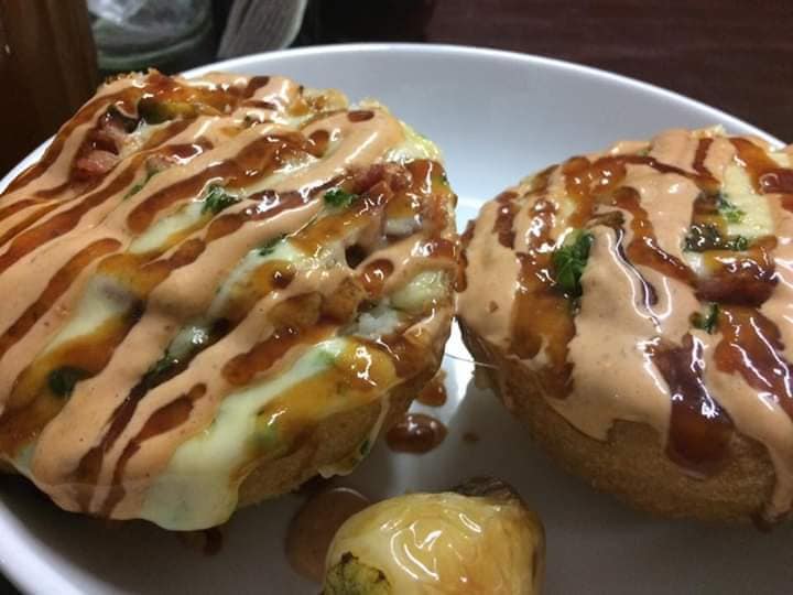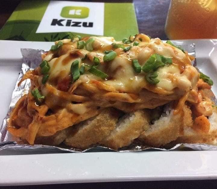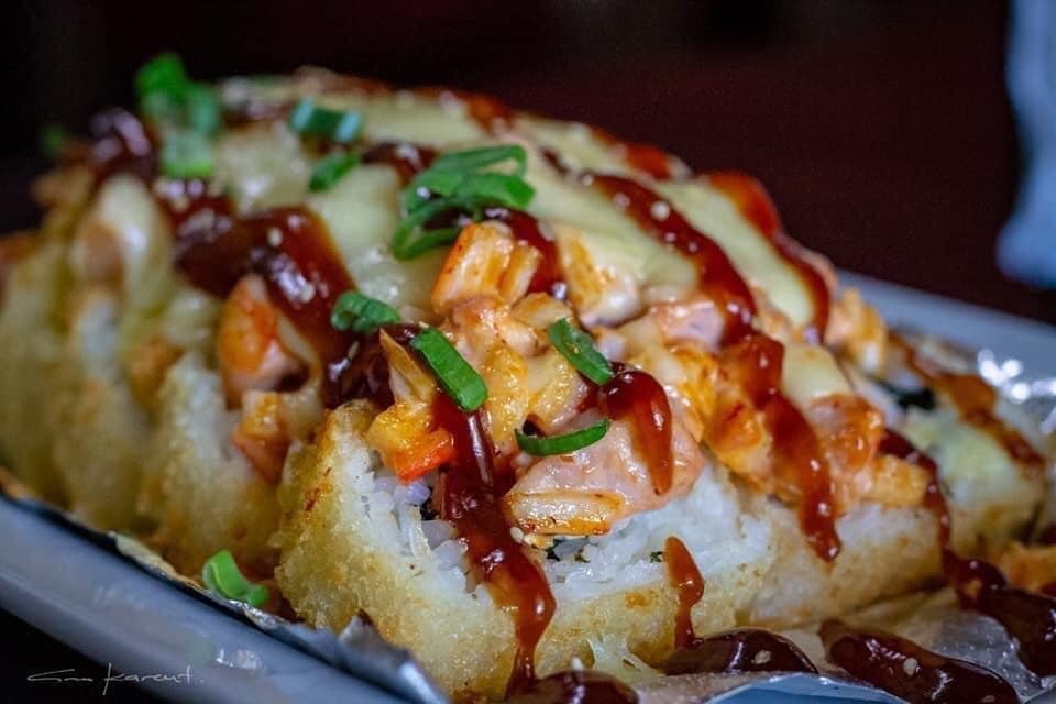 Rollo empanizado de camaron con un toping de cubitos de atun, camaron, surimi, aderezo de chipotle y gratinado con queso chihuahua
