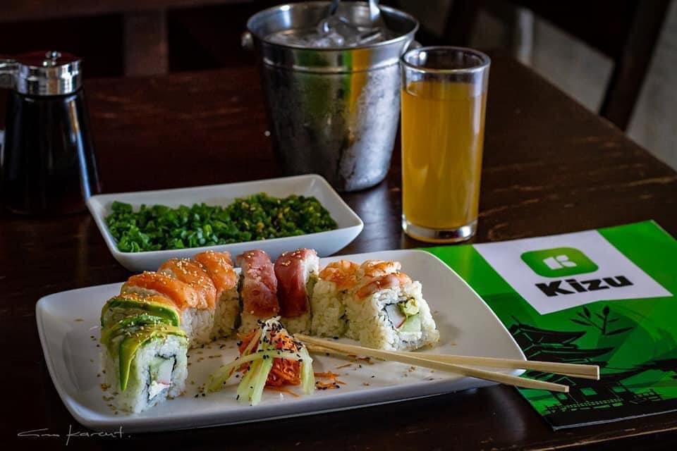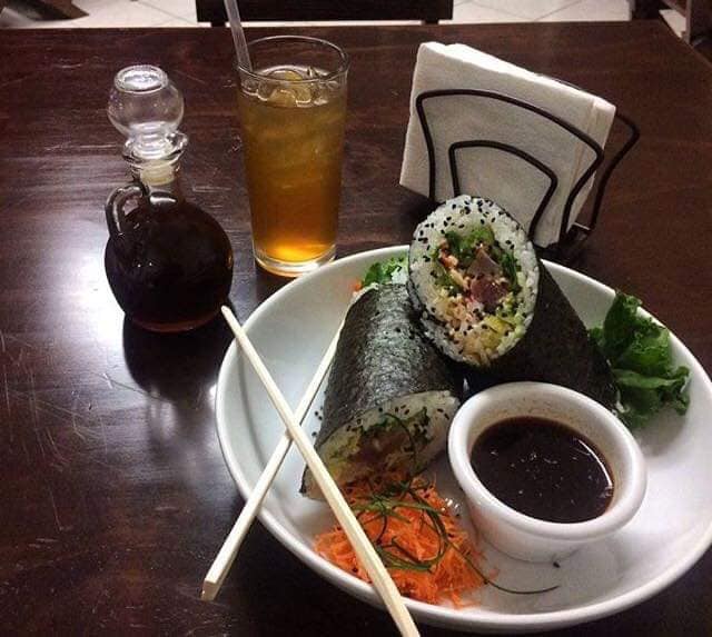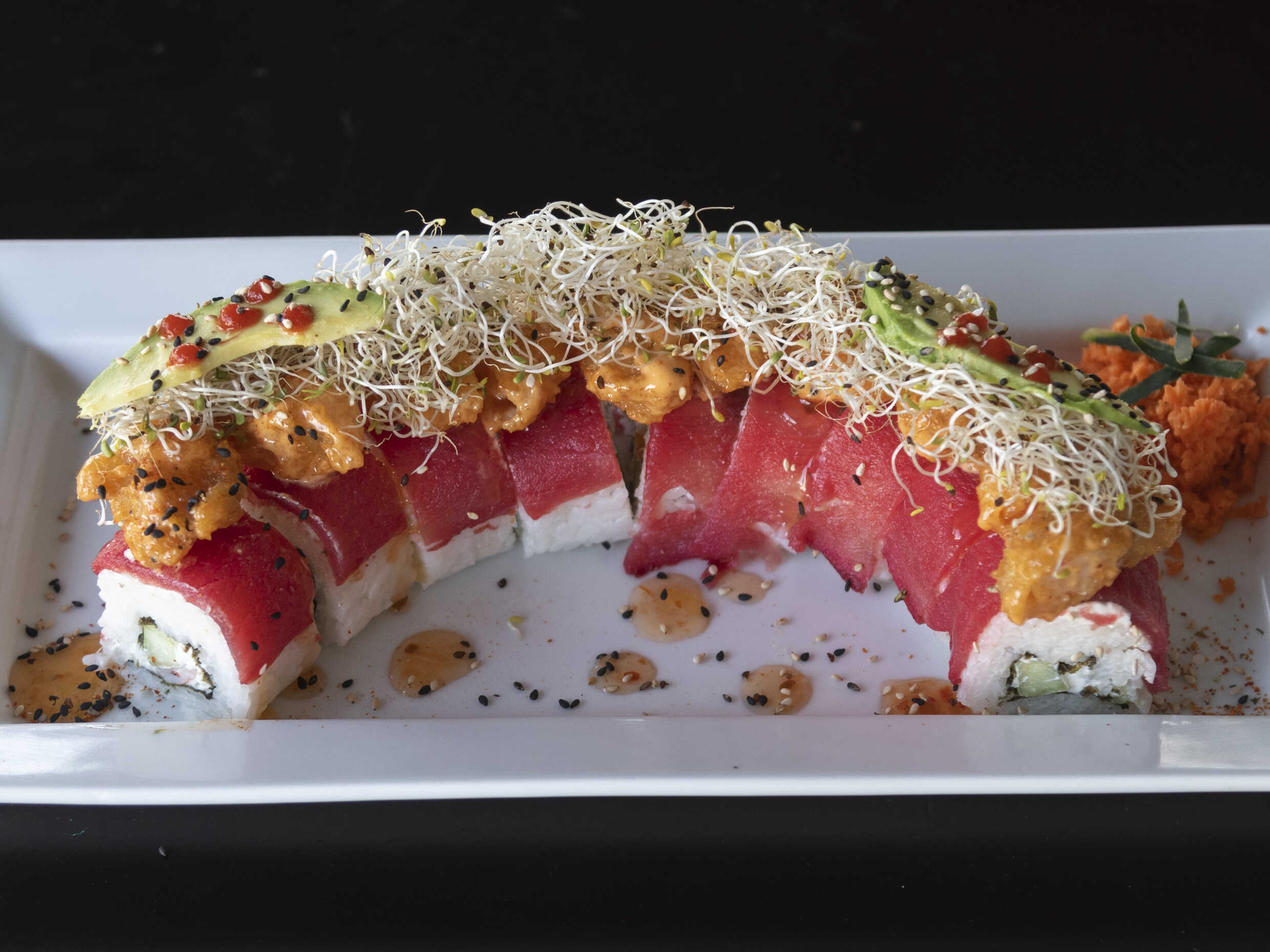 Rollo natural de camaron cubierto con laminas de atun y camarones roca con un toque de aderezos y germinado de alfalfa