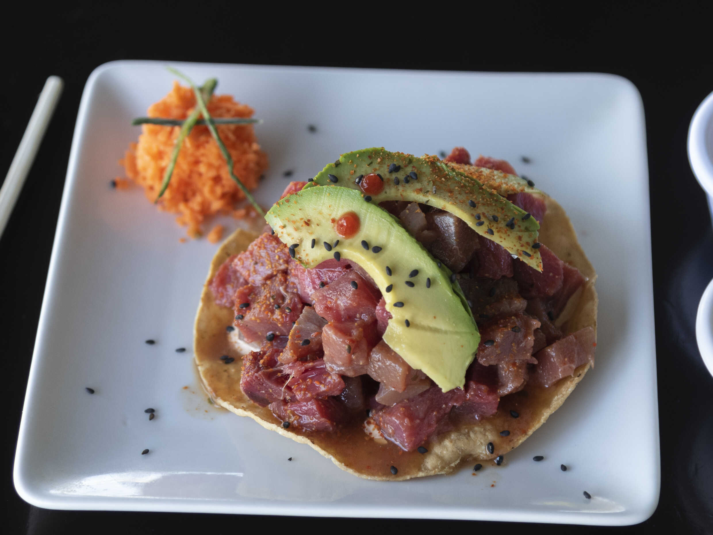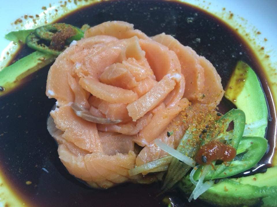 Atun marinado en salsa sashimi, aguacate, aderezo chipotle