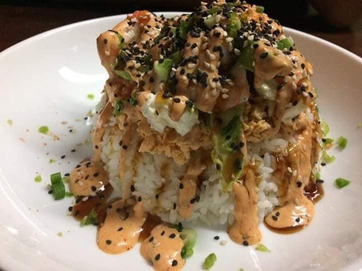 Gohan (arroz blanco) con toping de ensalada tampico, aguacate, queso crema, aderezo chipotle y anguila