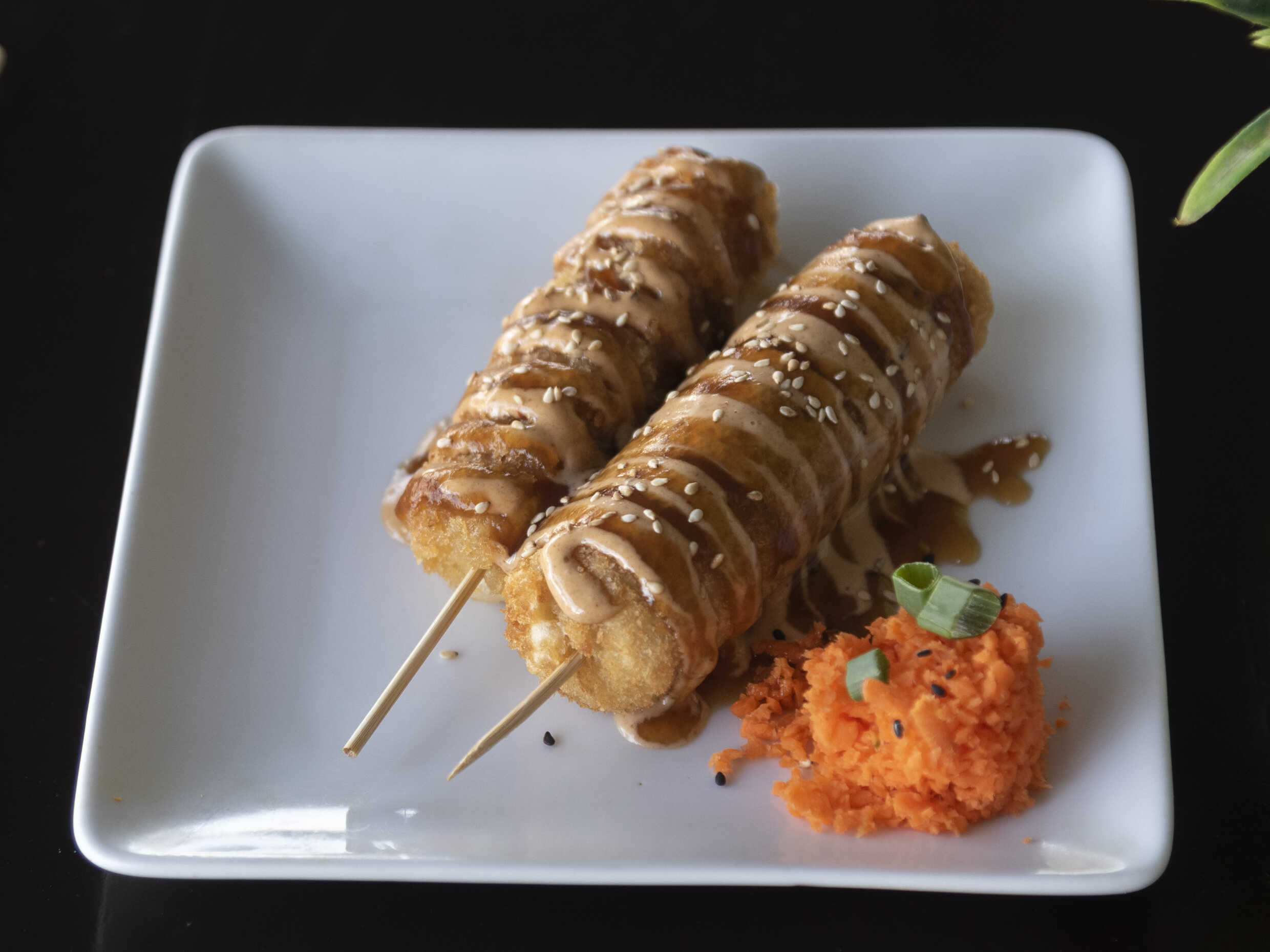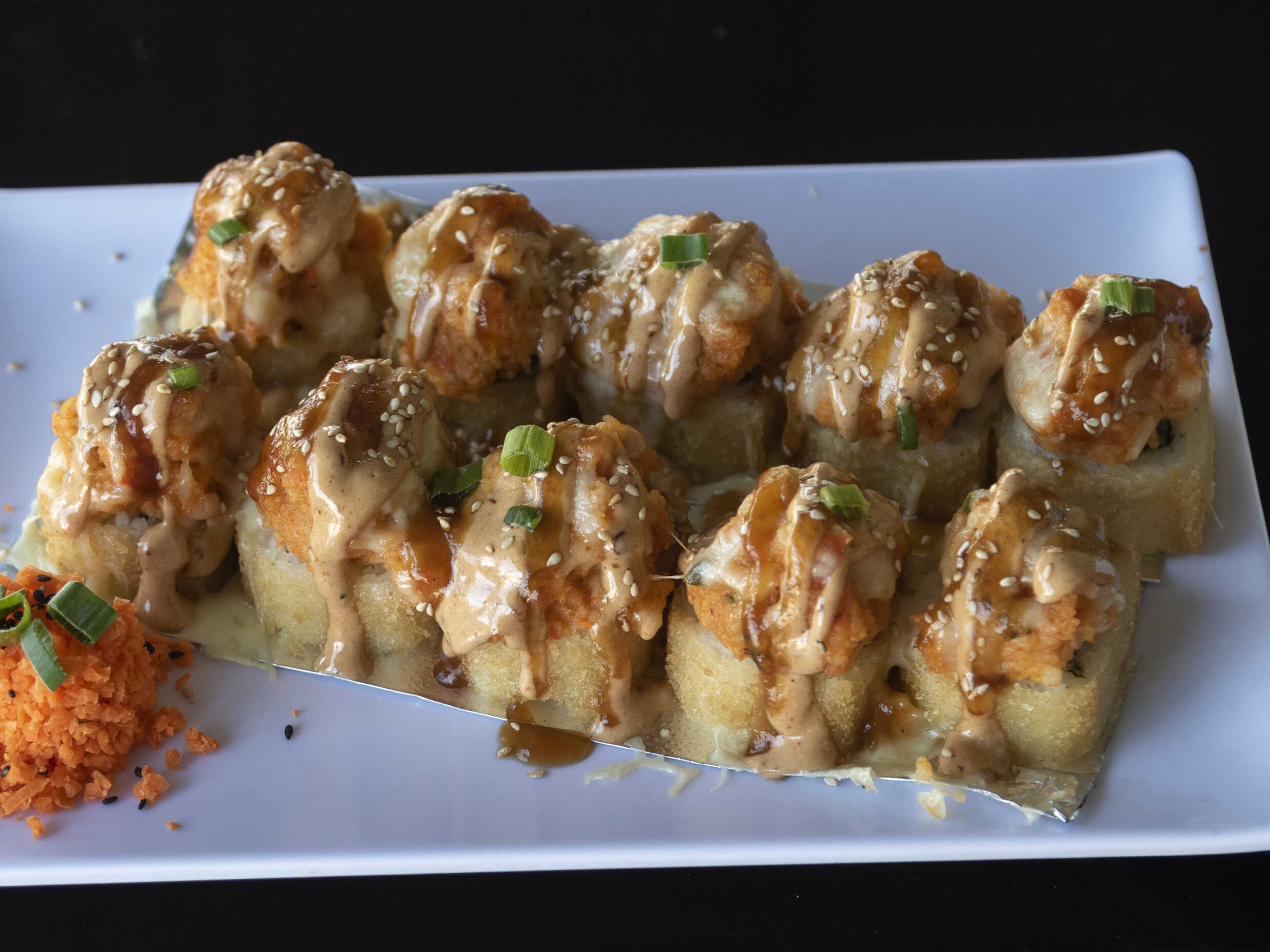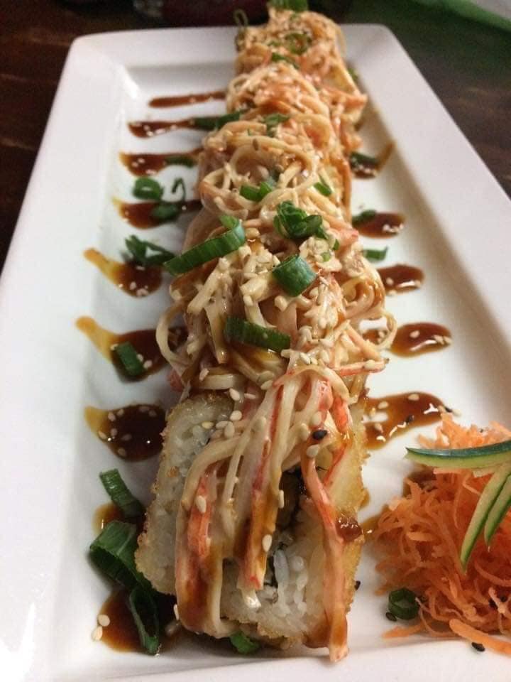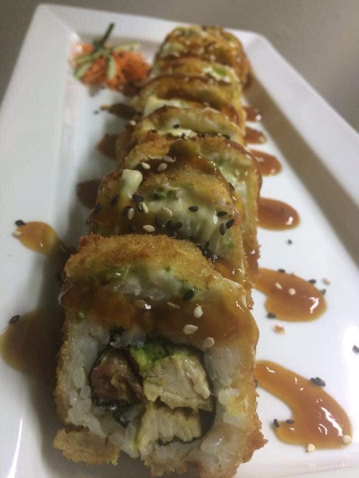 Rollo empanizado de cangrejo con un toping de kanicama y camaron con chipotle