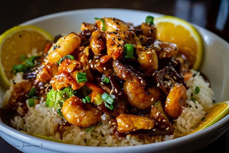Camarones empanizados en salsa hotcrab, seleccion de vegetales