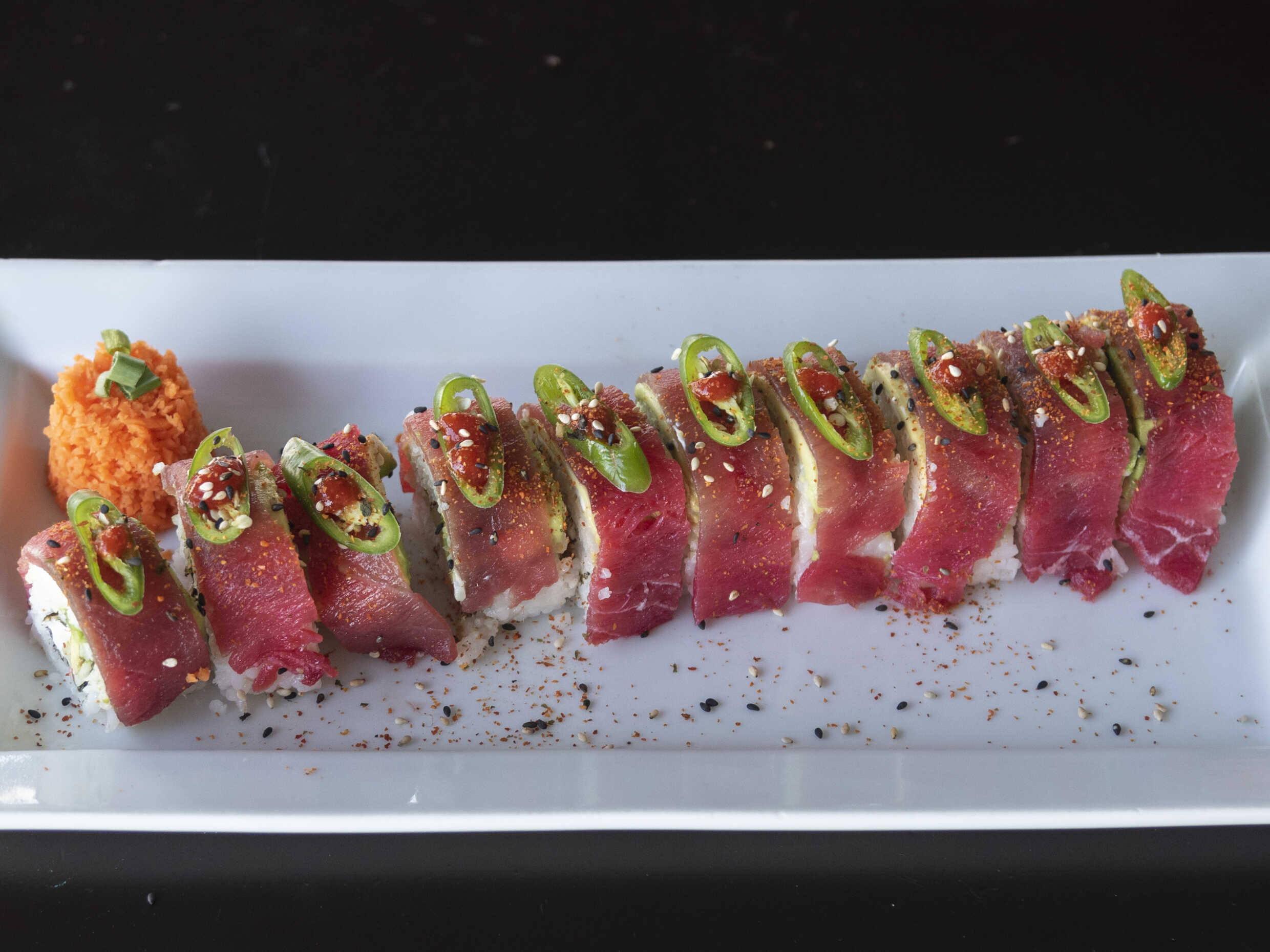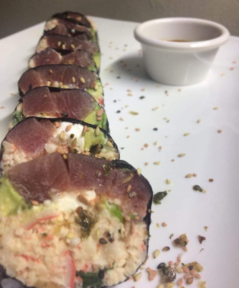 Rollo de atun por dentro, aguacate, pepino, queso crema, con un toping de atun con chipotle