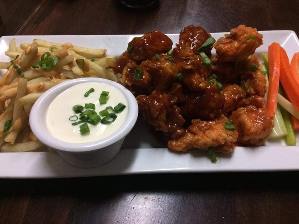 Delisiosos trozos de pollo acompañados de papas fritas