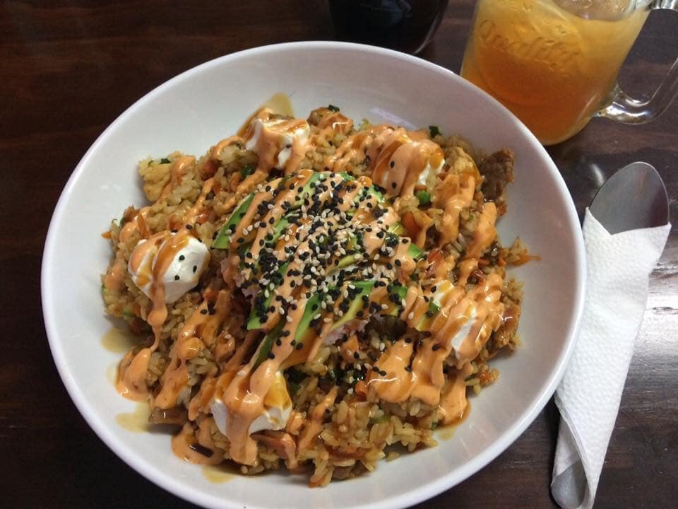 Arroz frito con vegetales, aguacate, queso crema y ensalada de cangrejo