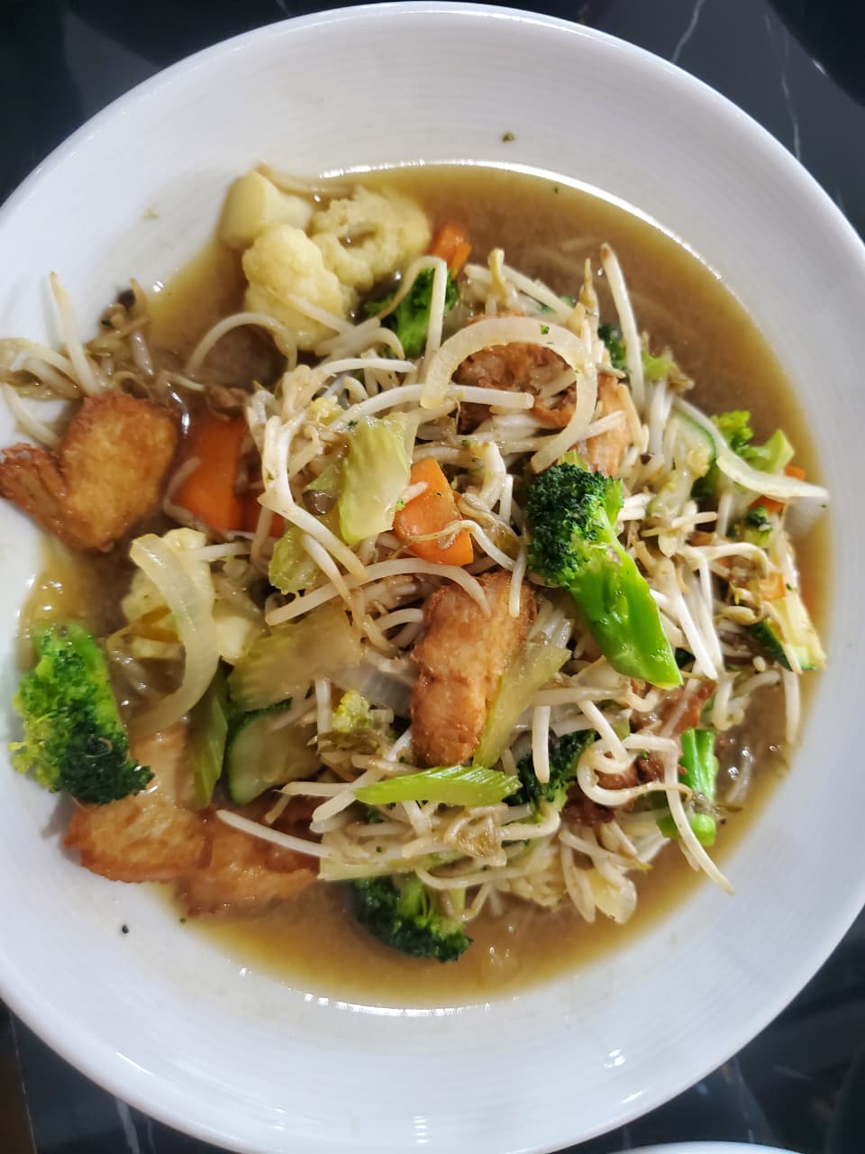 Medio litro de Pollo, camarón, fideos, brócoli, jícama, zanahoria y elote.