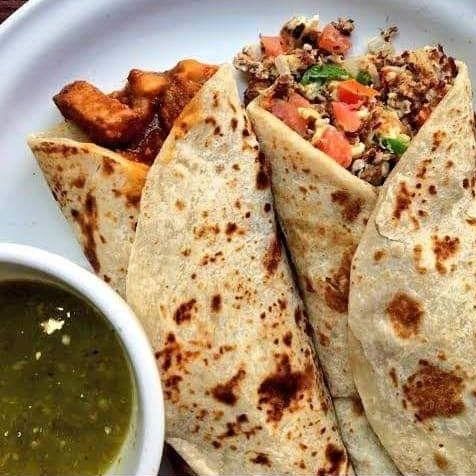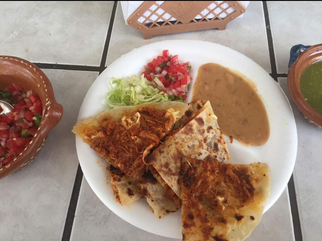 Quesadilla en tortilla de harina doble con guiso a elegir, frijoles puercos tradicionales, lechuga y salsa de la casa.
