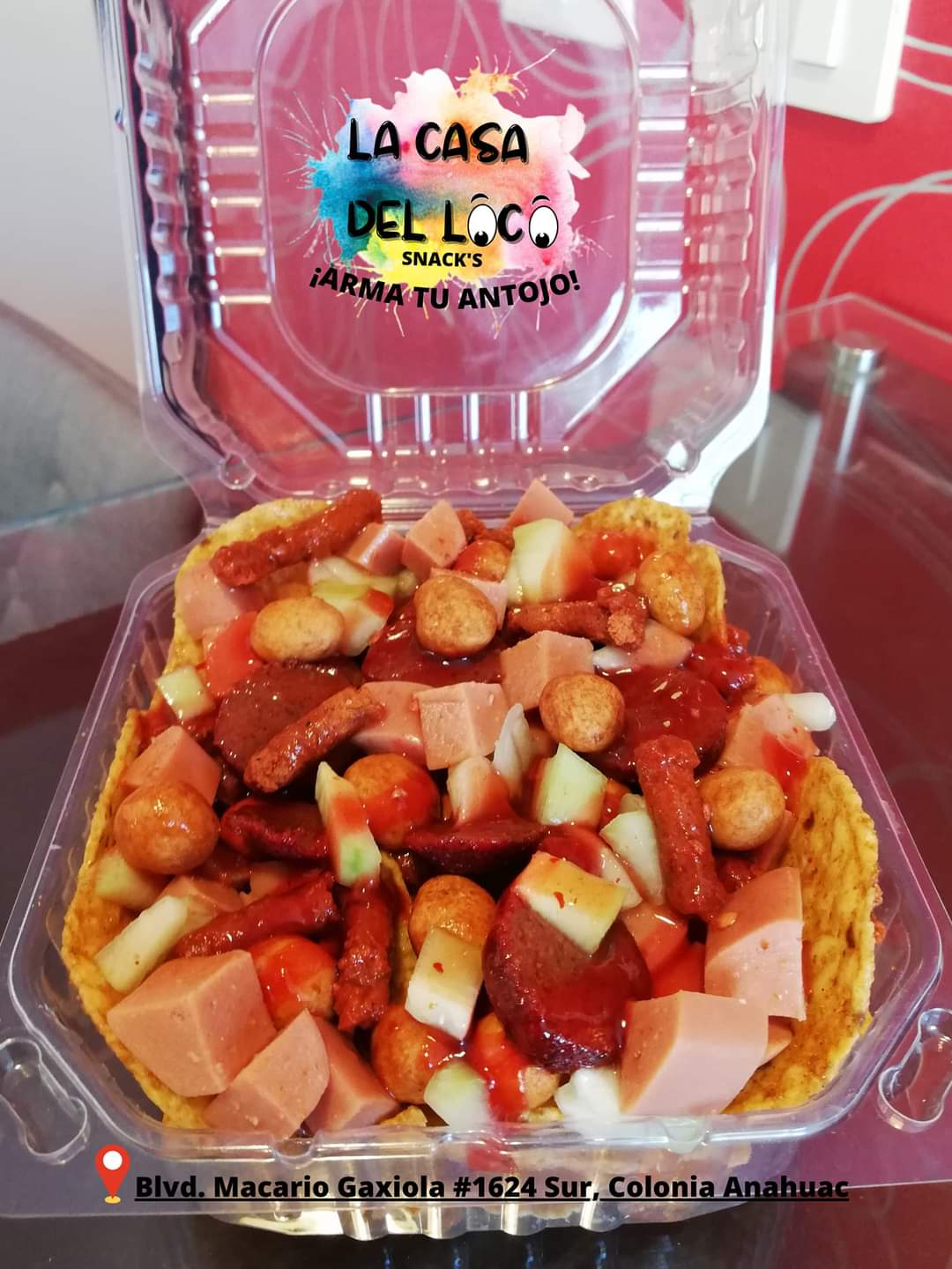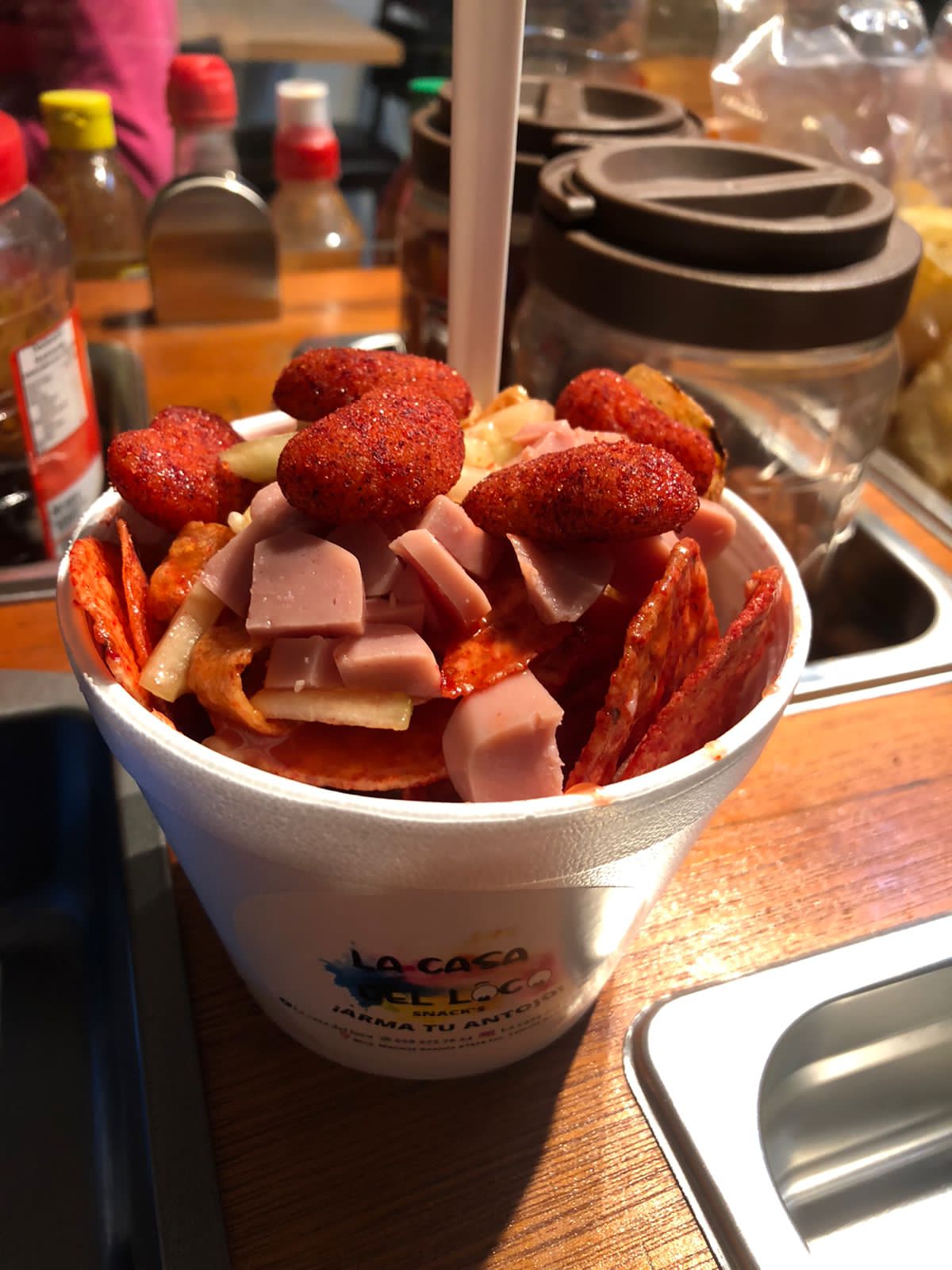 Tostitos, cacahuate, rielito, Clamato, serpentina, chamoy, salchicha, limón.