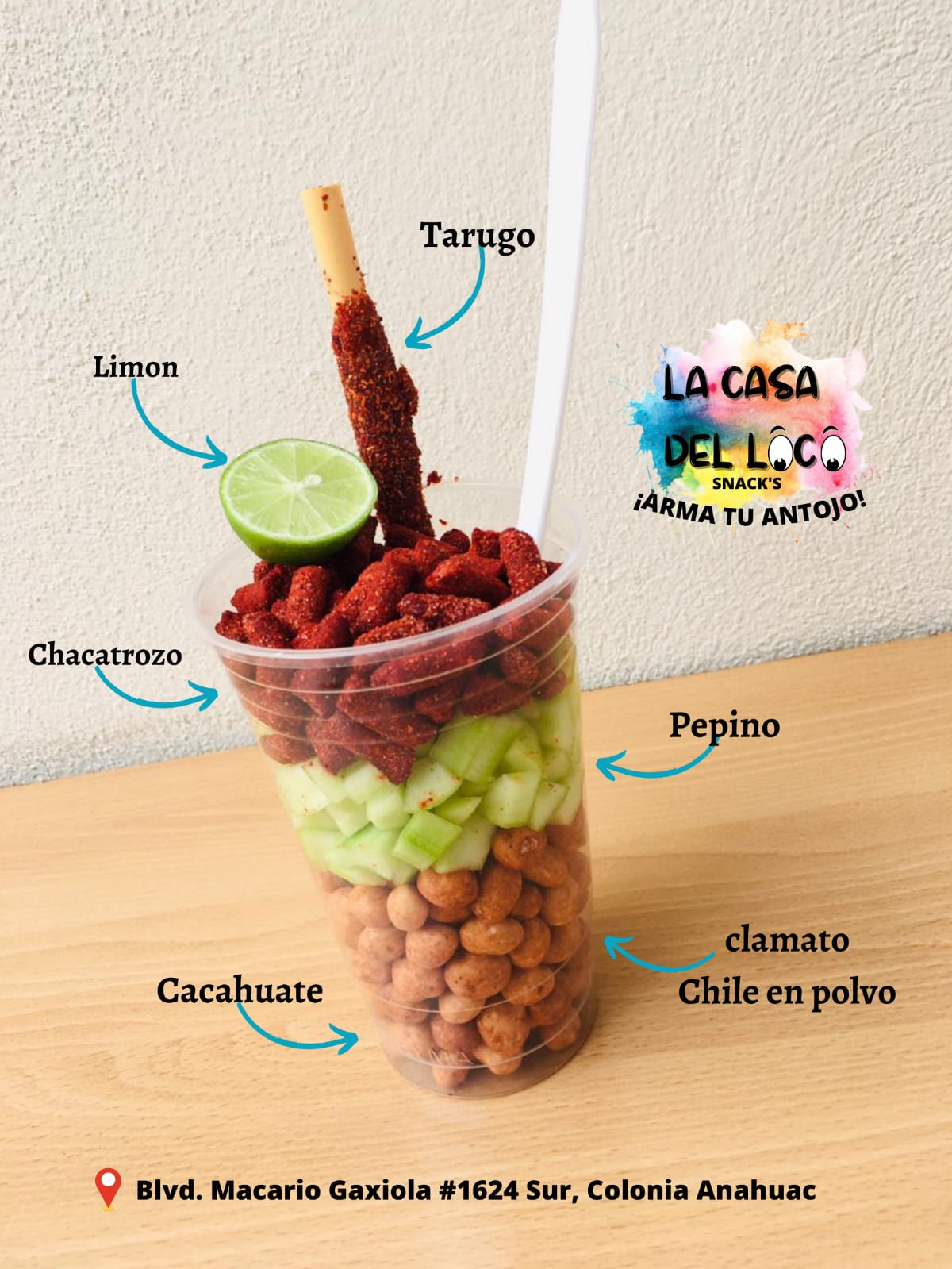 Arma tu loco con 1 Sabrita o papá y 4 ingredientes de la barra (gomitas chile, gomitas azucaradas, riel, cacahuate, gusano, serpentina, macabola, tarugo, pepino y salchicha) incluye clamato OJO elije tus ingredientes aquí abajo