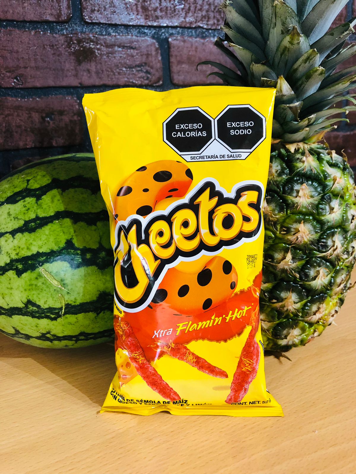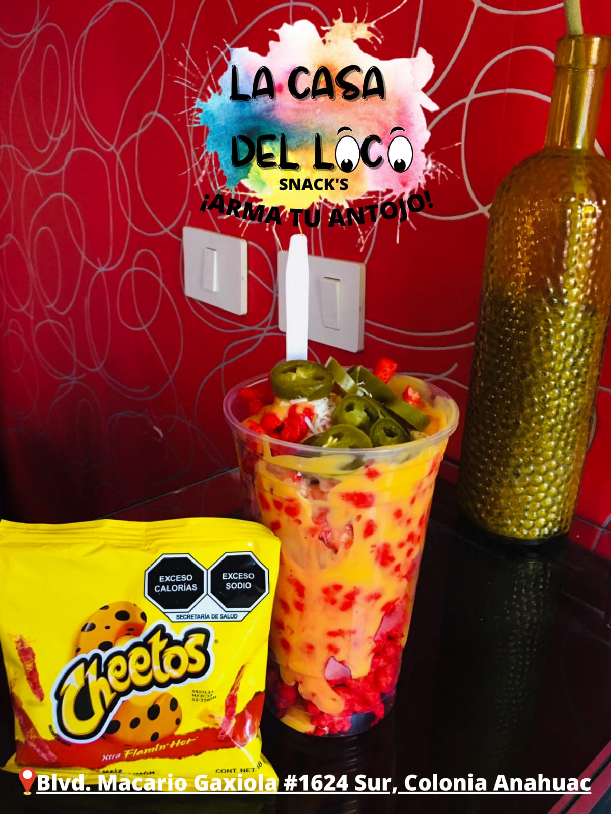 Cheetos Flamin Hot, queso amarillo, queso blanco, chiles jalapeños.