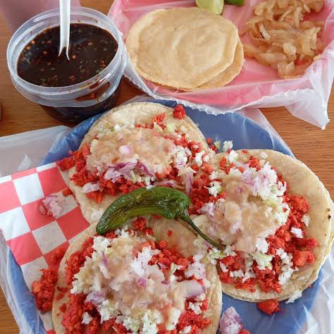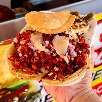 Tortilla doble de maiz con carne de cochinita pibil con lechuga y cebolla morada