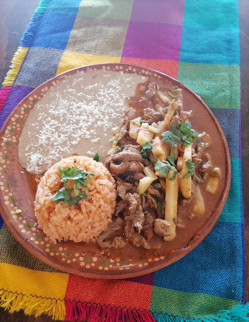 Machaca, chilaquiles, frijoles y huevo estrellado.