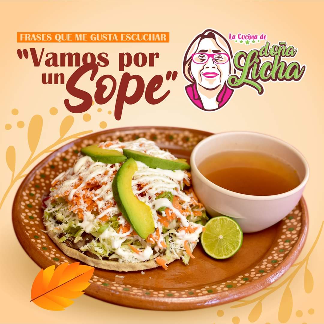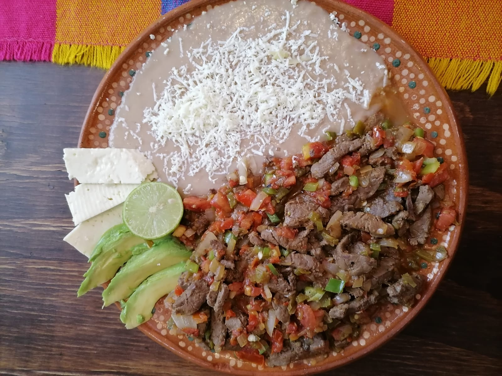 Totopos, cochinita, frijol, queso amarillo, queso rallado, crema y carne.