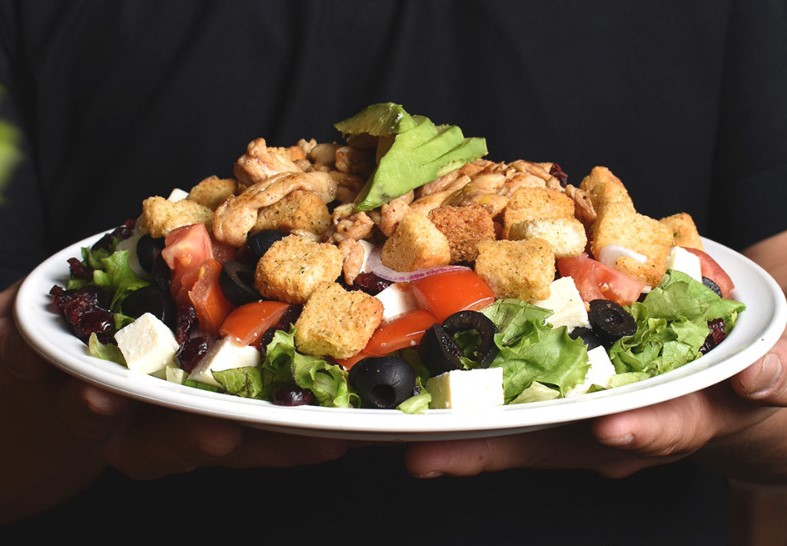 La mezcla perfecta: trozos de lechuga fresca, tomate, aguacate, queso tipo panela, aceitunas negras, cebolla morada, jugosa pechuga de pollo a la plancha, arándanos deshidratados acompañados de crujientes crotones y aderezo.