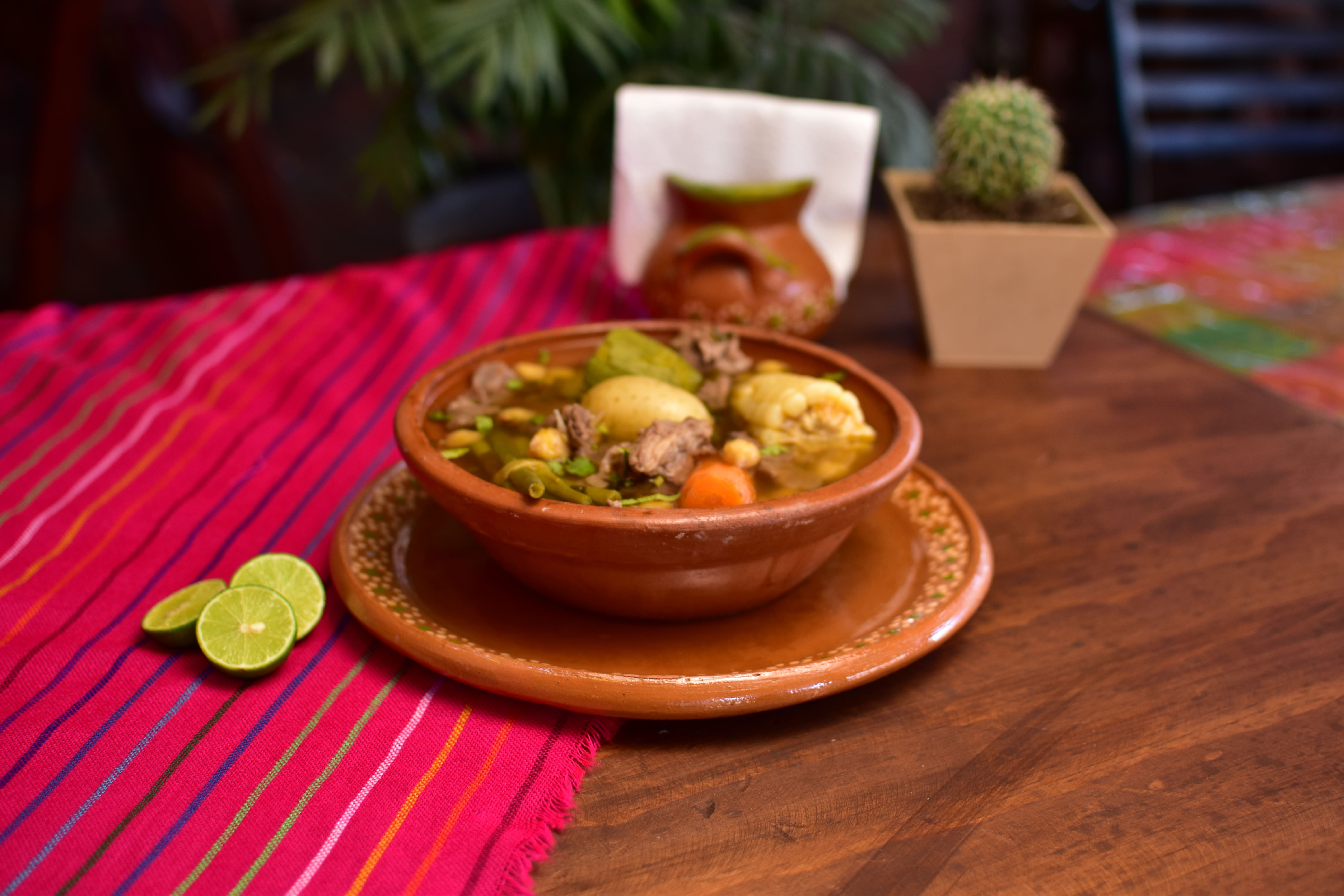 1 Consomé de pollo, acompañado de asientos de puerco, queso gratinado Chihuahua, lechuga, cebolla curtida y carne asada.