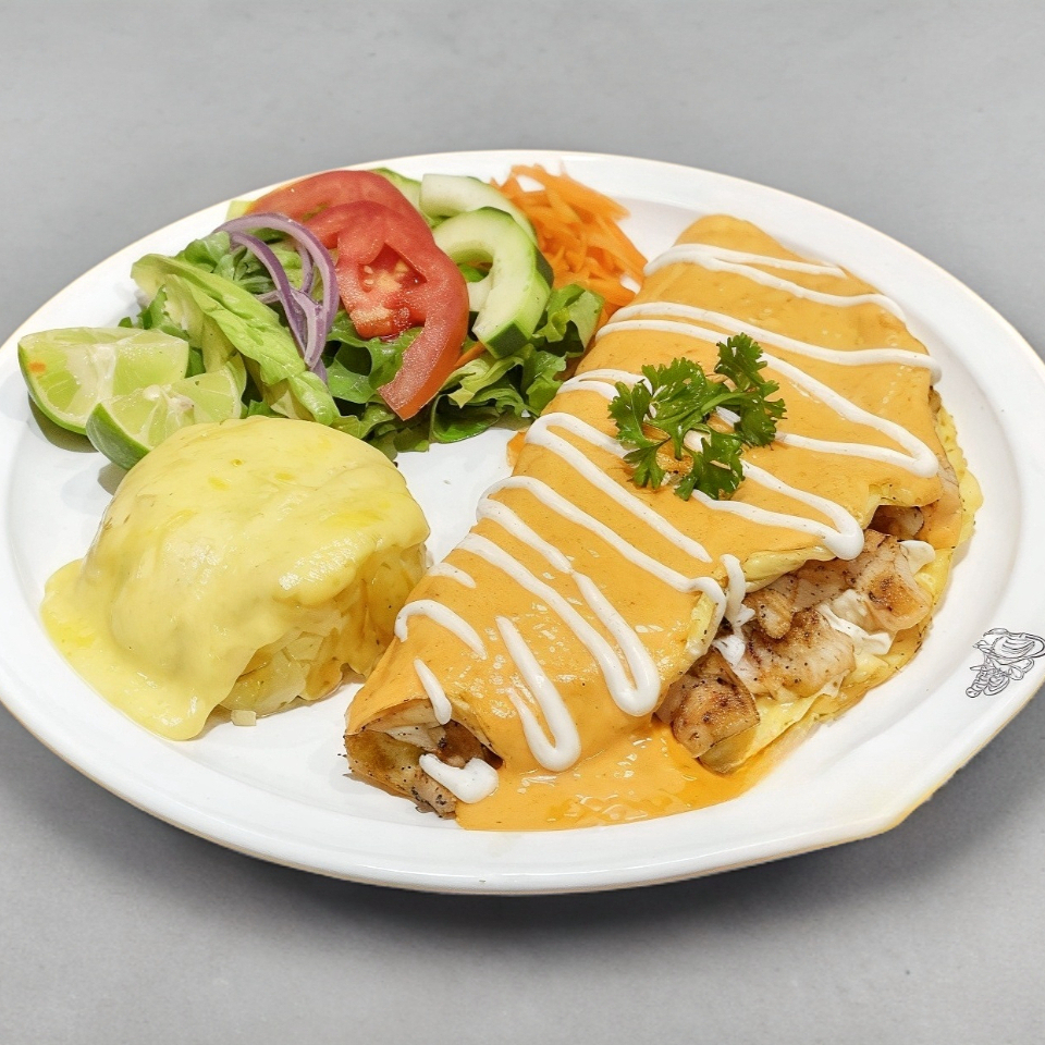 Omelette especial de la casa con arroz cubierto con queso y ensalada