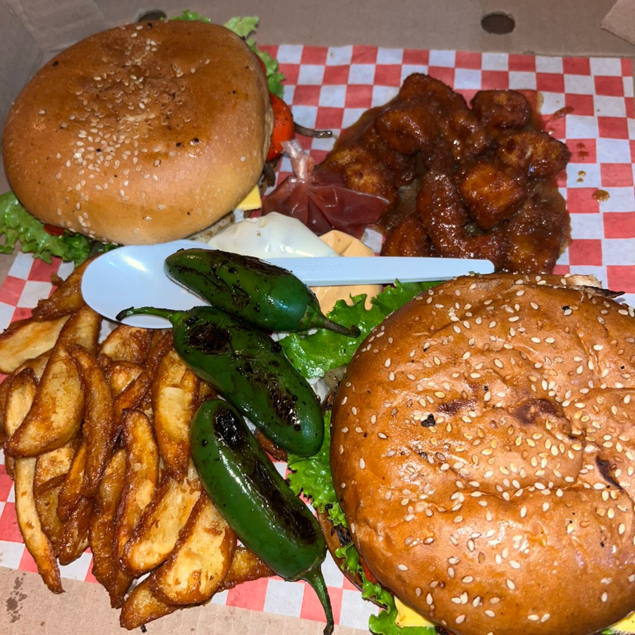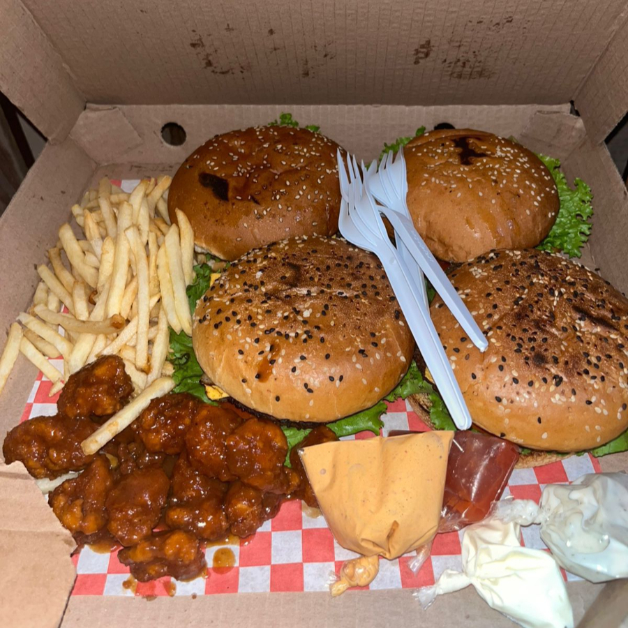 (2 hamburguesas al pastor, 1 orden de boneless y 1 orden de papas)