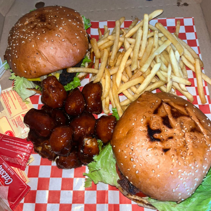 (2 hamburguesas Sencillas, 1 orden de boneless y 1 orden de papas)
