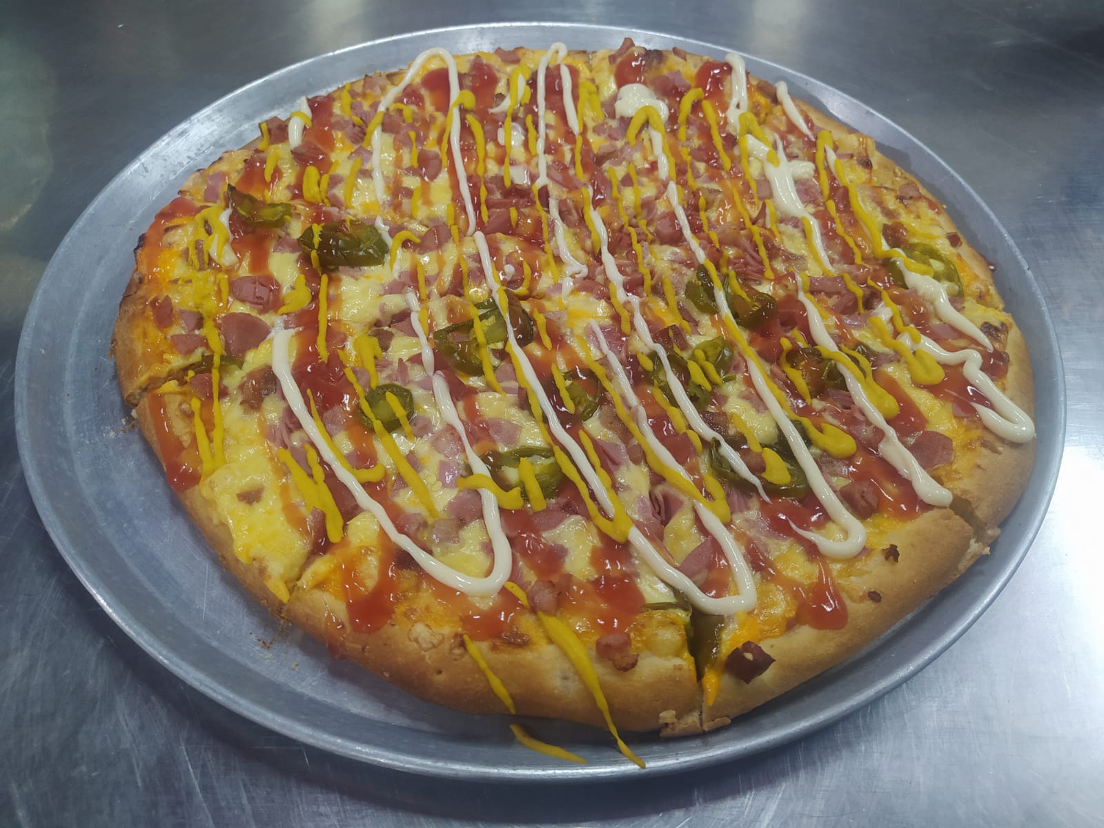 Jamón, salchicha, tocino, jalapeño y aderezos.
