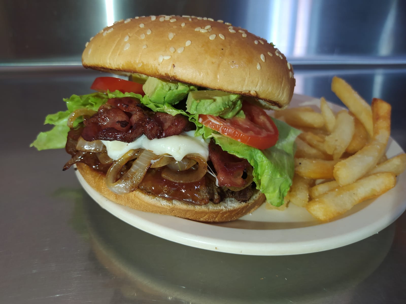 Carne bañada en salsa BBQ, cebolla asada, queso gratinado, tocino, aguacate, lechuga, tomate y aderezo.