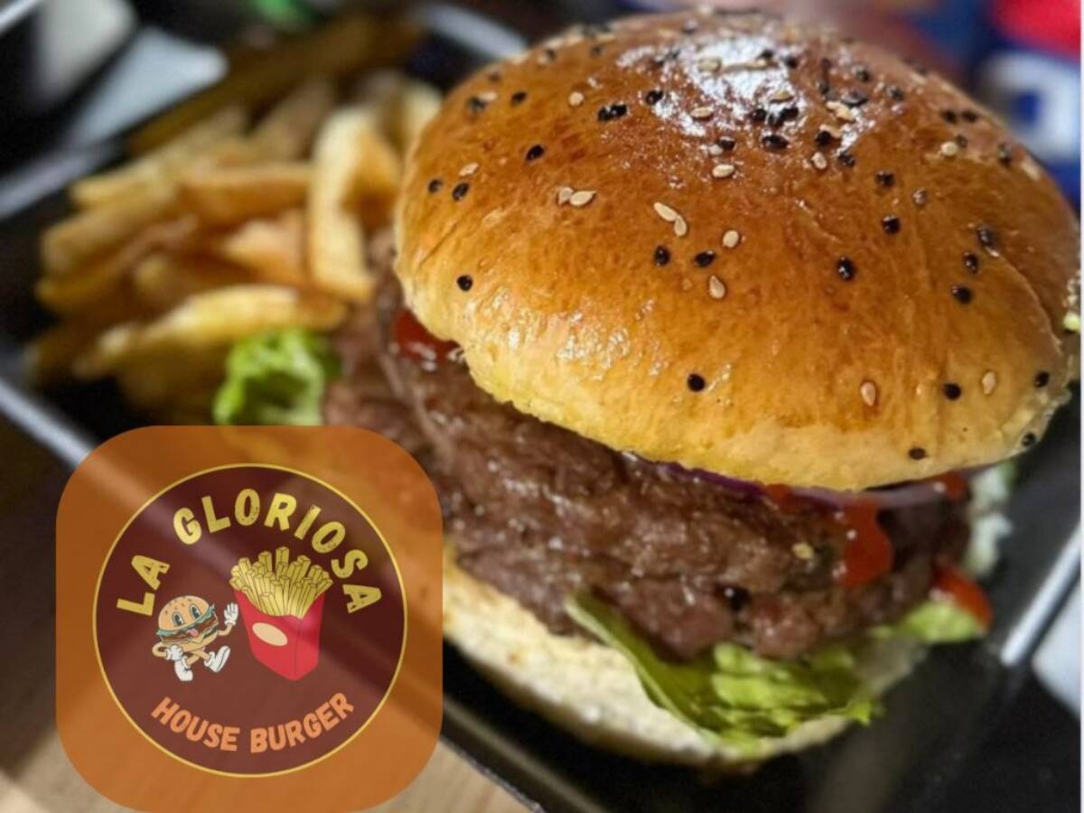 Hamburguesa clasica de carne arrachera, cebolla caramelizada, pepinillos, tomate, lechuga y queso.