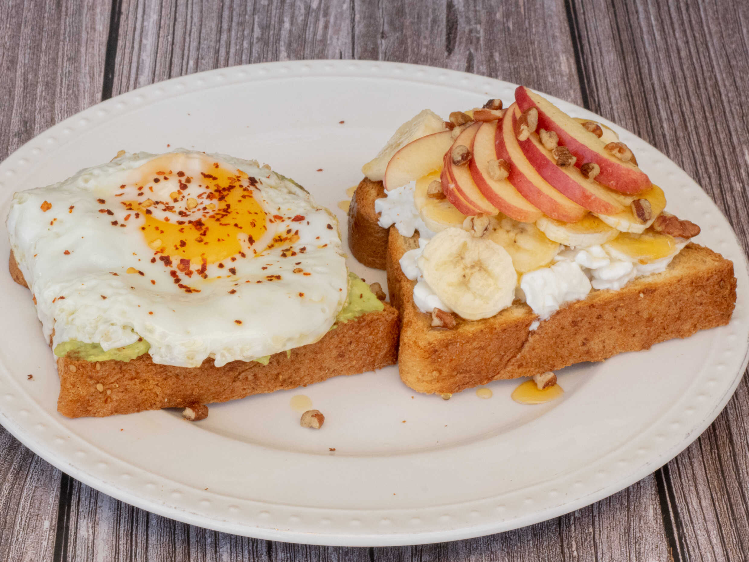 Un pan tostado con huevo estrellado mas un pan con fruta, cottage, miel y chia