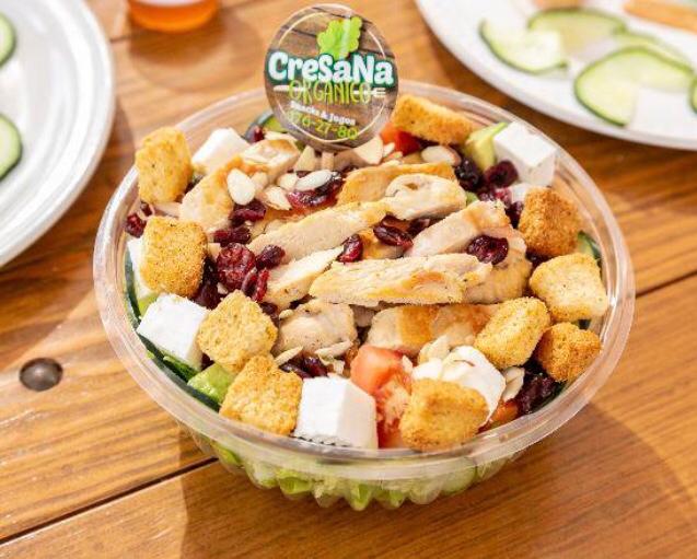 Lleva lechuga, tomate, pepino, aguacate, panela, almendra, arándano, crotones y aderezo.
