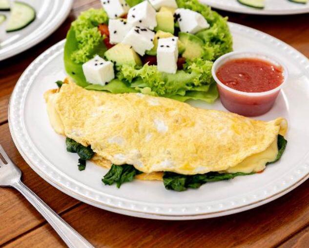 Tortilla integral rellena de tomate asado, espinacas, queso manchego y huevo estilo omelet, acompañado de ensalda fresca y salsa