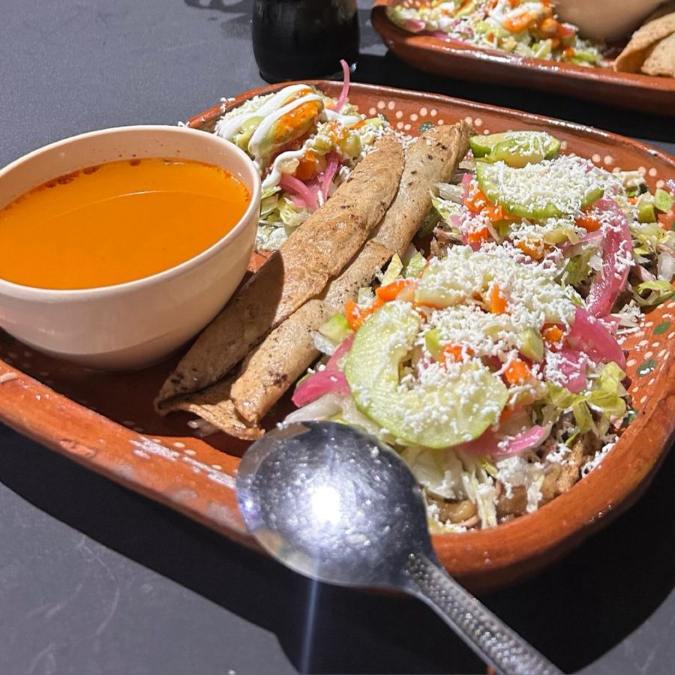 Por dentro frijol refrito y carne. Vegetales (lechuga, cebolla curtida, zanahoria y calabaza precocida y queso de rancho rallado)