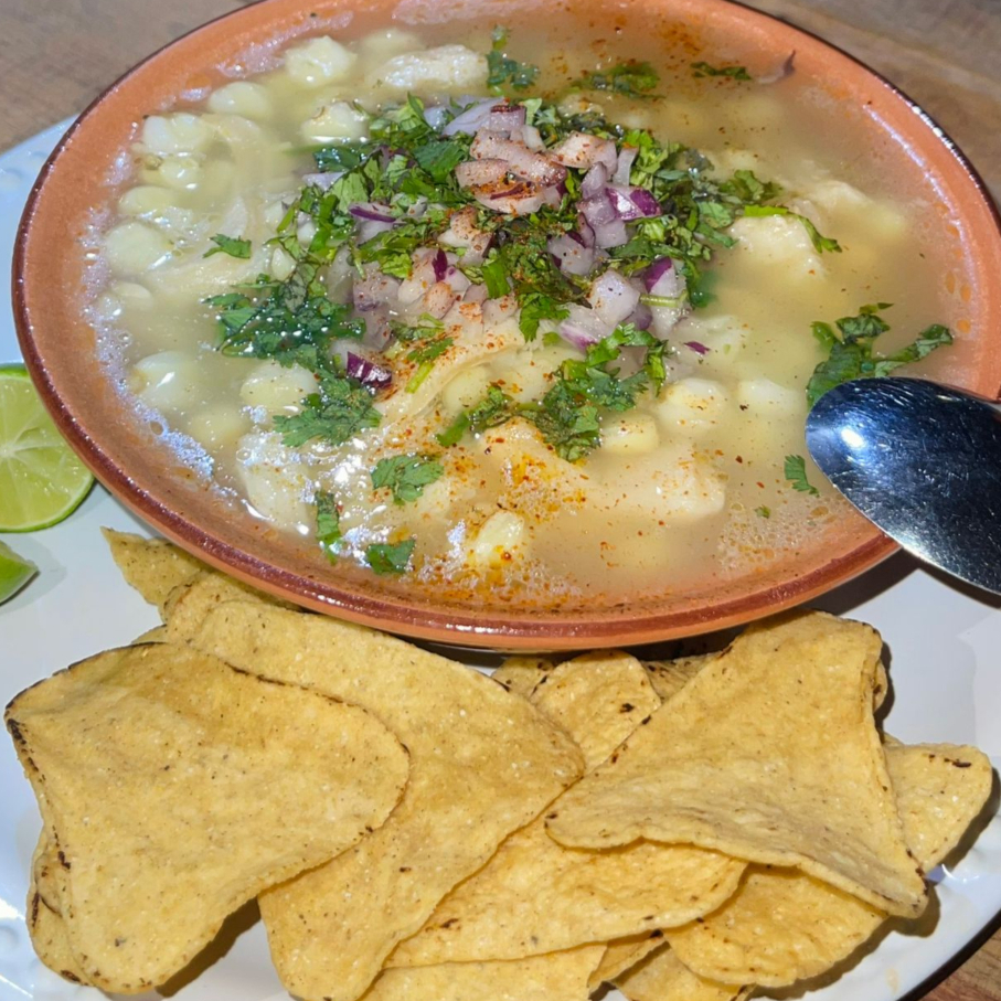 LITRO DE POZOLE, ACOMPAÑADO DE CEBOLLA, CILANTRO Y TOSTADAS.