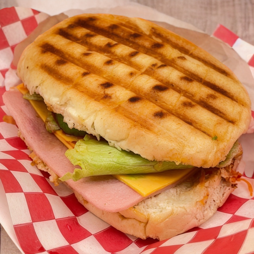 Torta especial de pierna de cerdo, con jamón, queso americano, pan telera, lechuga, aguacate, cebolla, zanahoria.