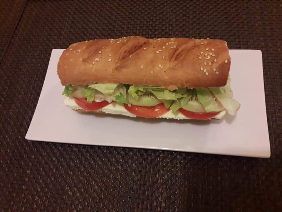 Jamón pechuga de pavo, lechuga italiana, tomate, pepino, zanahoria rallada, pan horneado con aderezo de la casa y queso mozzarella.