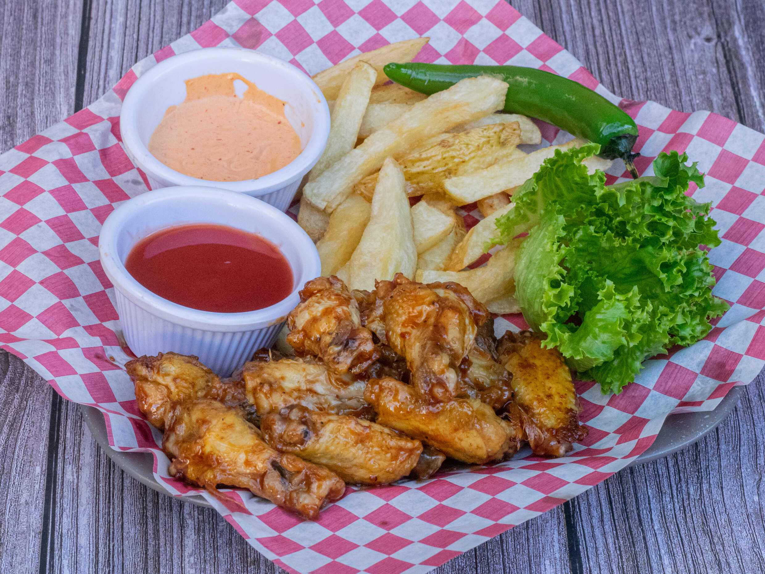 Salsa a elegir entre BBQ, búffalo ó salsa de ostión. Incluye papas a la francesa.