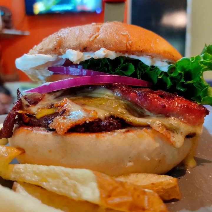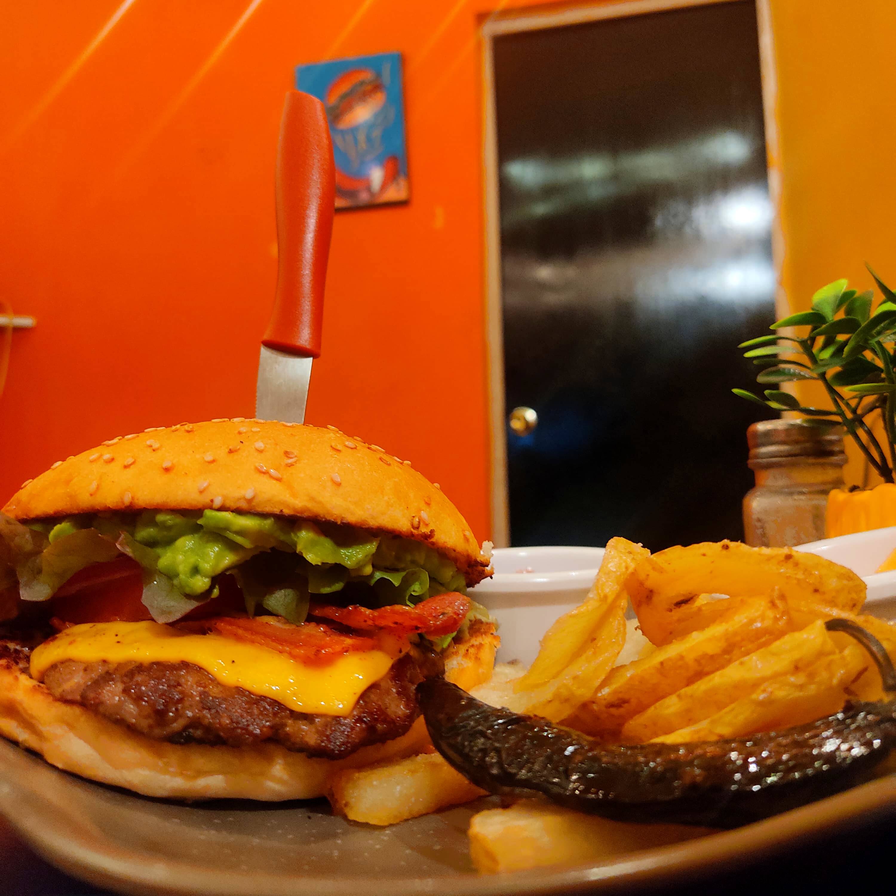Carne de sirloin, preparada, tocino queso americano, cebolla morada y tomate con salsa, abundante guacamole casero, acompañada de papas a la francesa.